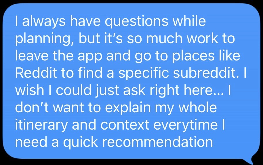 Tools lack "vibe-based" discovery (e.g., "Where is a good date spot near me right now?").